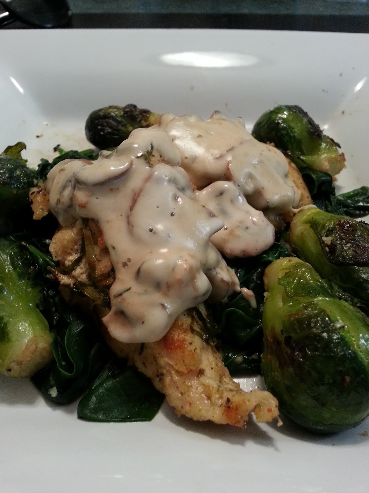 The sides I used for this particular plate were Garlic Spinach and roasted Brussel Sprouts. The Sprouts were placed on a grill, drizzled with Olive Oil and Sea Salt. Garlic Spinach is very easy to make. All you need is fresh minced garlic, Olive Oil and Sea Salt. Cook the garlic in a pan and add 2 fistfuls of washed Spinach leaves. Feel free to pile it on as it shrinks down when it wilts. Once it starts to wilt, turn off the heat and toss while it’s still on the burner. Don’t overcook it because you don’t want to lose the essential nutrients. Takes about 5 minutes to cook and tastes amazing!
