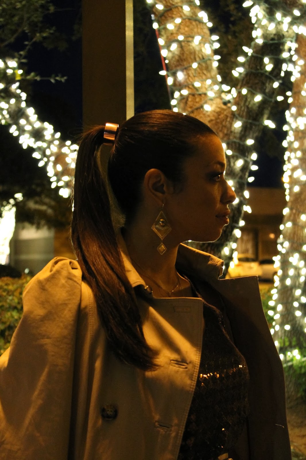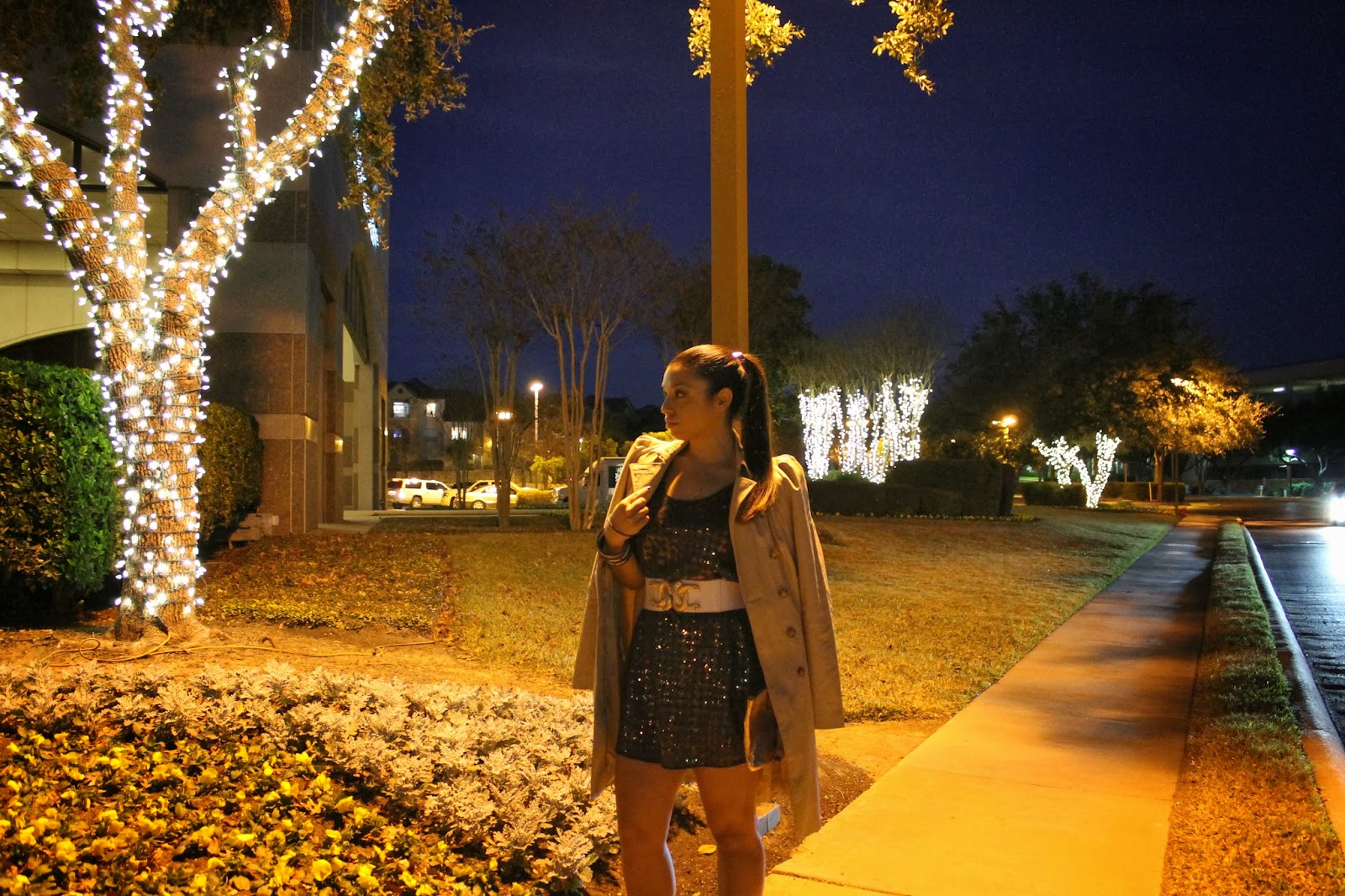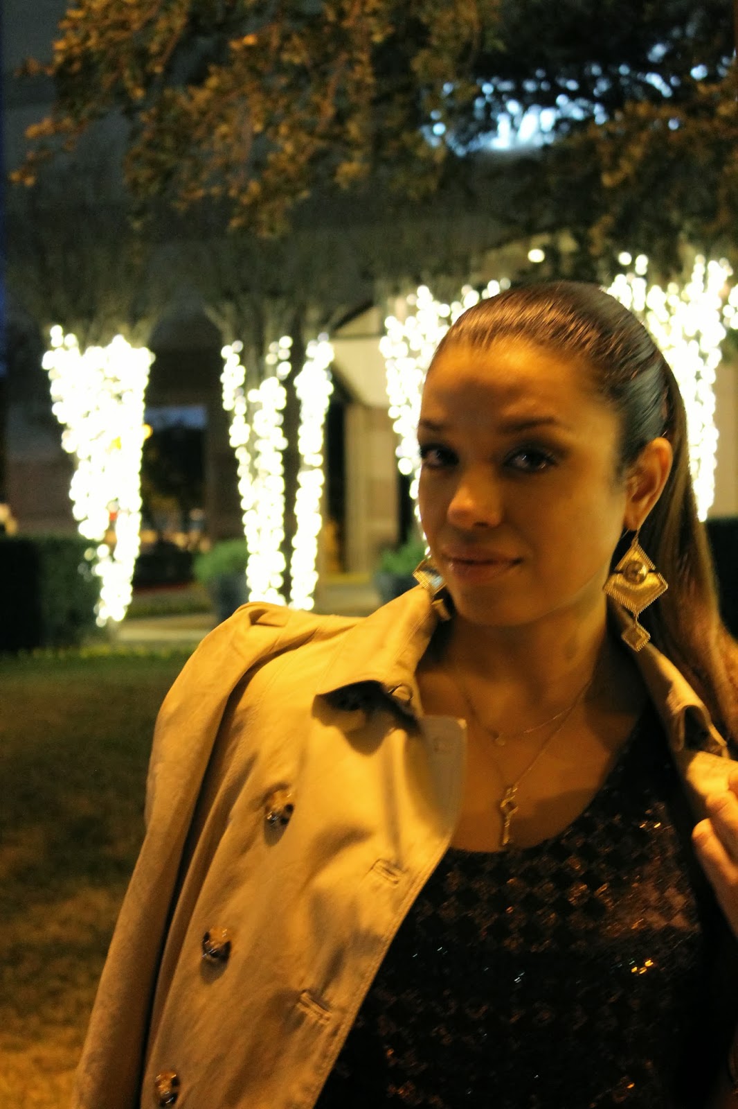 Dress: Lumiere from Escarcha Boutique (Puerto Rico), Art Deco Earrings and Belt: Escarcha Boutique, Rose Gold Bracelet: H&M (similar here), Clutch: Marc Jacobs for Neiman Marcus/Target Collection; Pumps: Crystal from Shoedazzle, Trench Coat: Zara similar style here