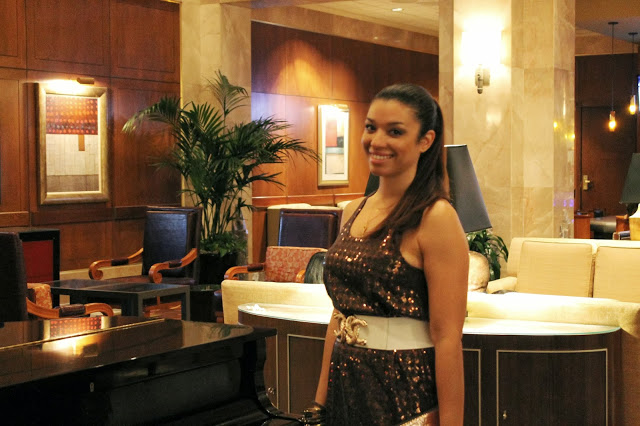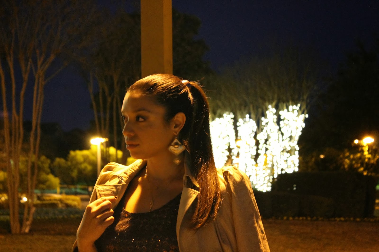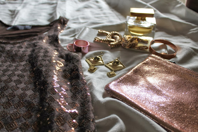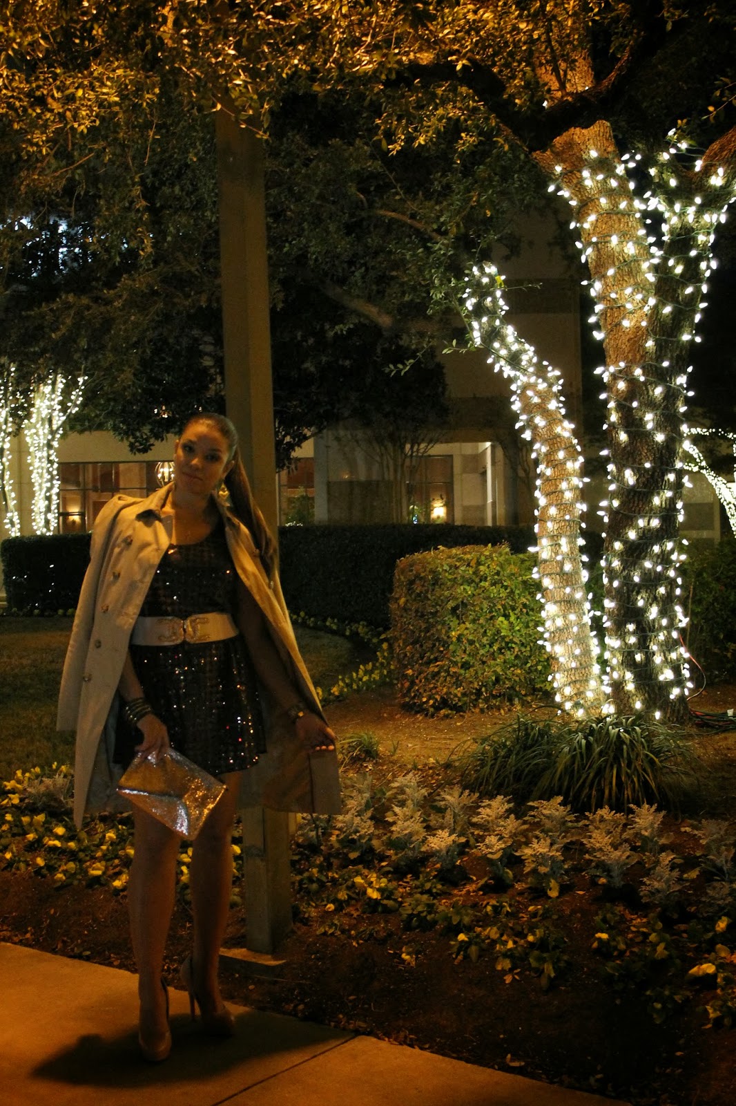 Dress: Lumiere from Escarcha Boutique (Puerto Rico), Art Deco Earrings and Belt: Escarcha Boutique, Rose Gold Bracelet: H&M (similar here), Clutch: Marc Jacobs for Neiman Marcus/Target Collection; Pumps: Crystal from Shoedazzle, Trench Coat: Zara similar style here