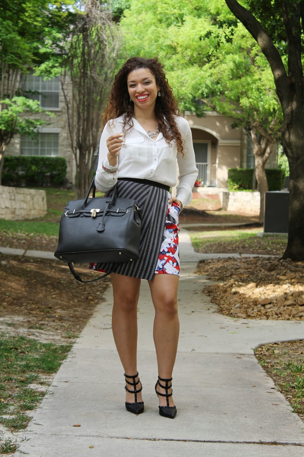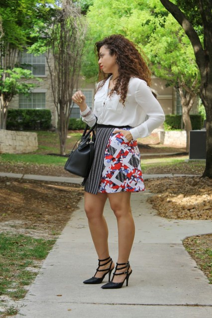 For my final installment of the Peter Peter for Target Series… (drum roll, please) The Skirt! This skirt is so amazing! The texture, stitching quality, mixed print and fit are all perfection. I love the overlay with the asymmetrical hemline. It is, by far, my favorite piece of the collection. I paired it with a sheer H&M blouse and my favorite pointy shoes.