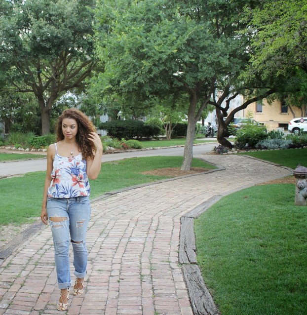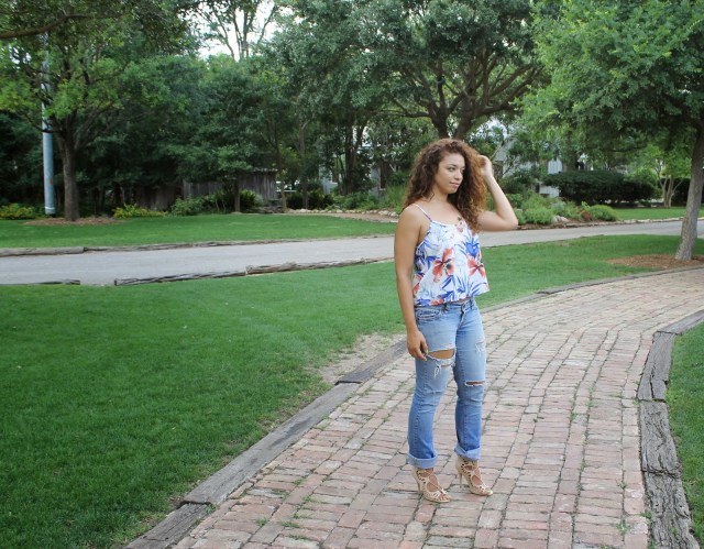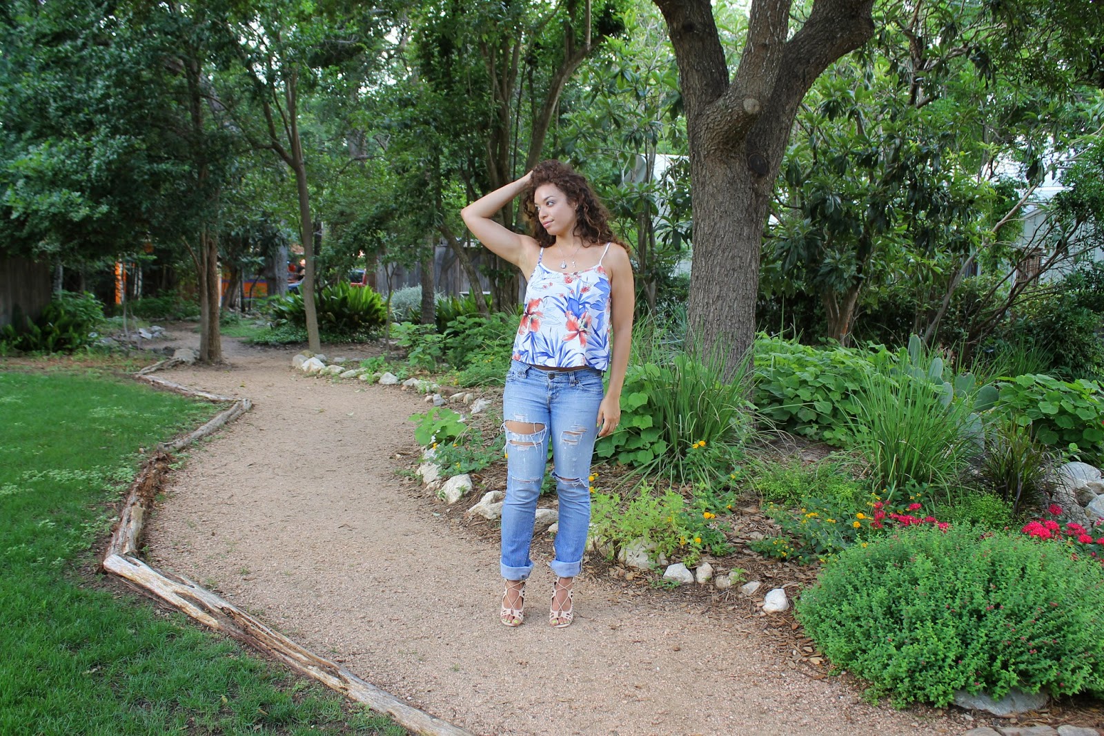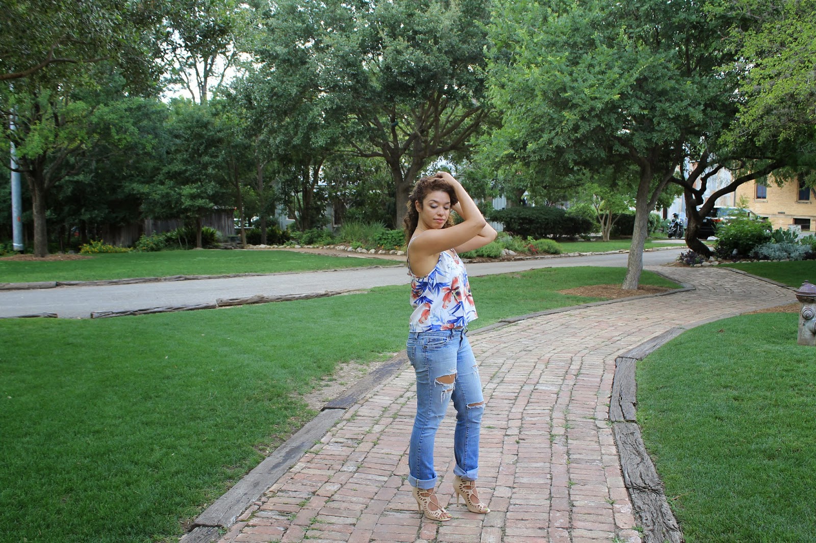 These pictures were taken by my father when we went out to Gruene. On our mini roadtrip, we went to an historic district in New Braunfels, TX about 1 hr North of San Antonio. It’s so pretty and the Gristmill Restaurant is right on the Guadalupe River. It’s just so peaceful and lovely. The food is really good too! I was casual in my naturally ripped Guess jeans, a floral top, dressed up with lace-up heels. The following weekends are great opportunities to venture out to neighboring towns and discover more of Texas. What adventures are you planning this summer?