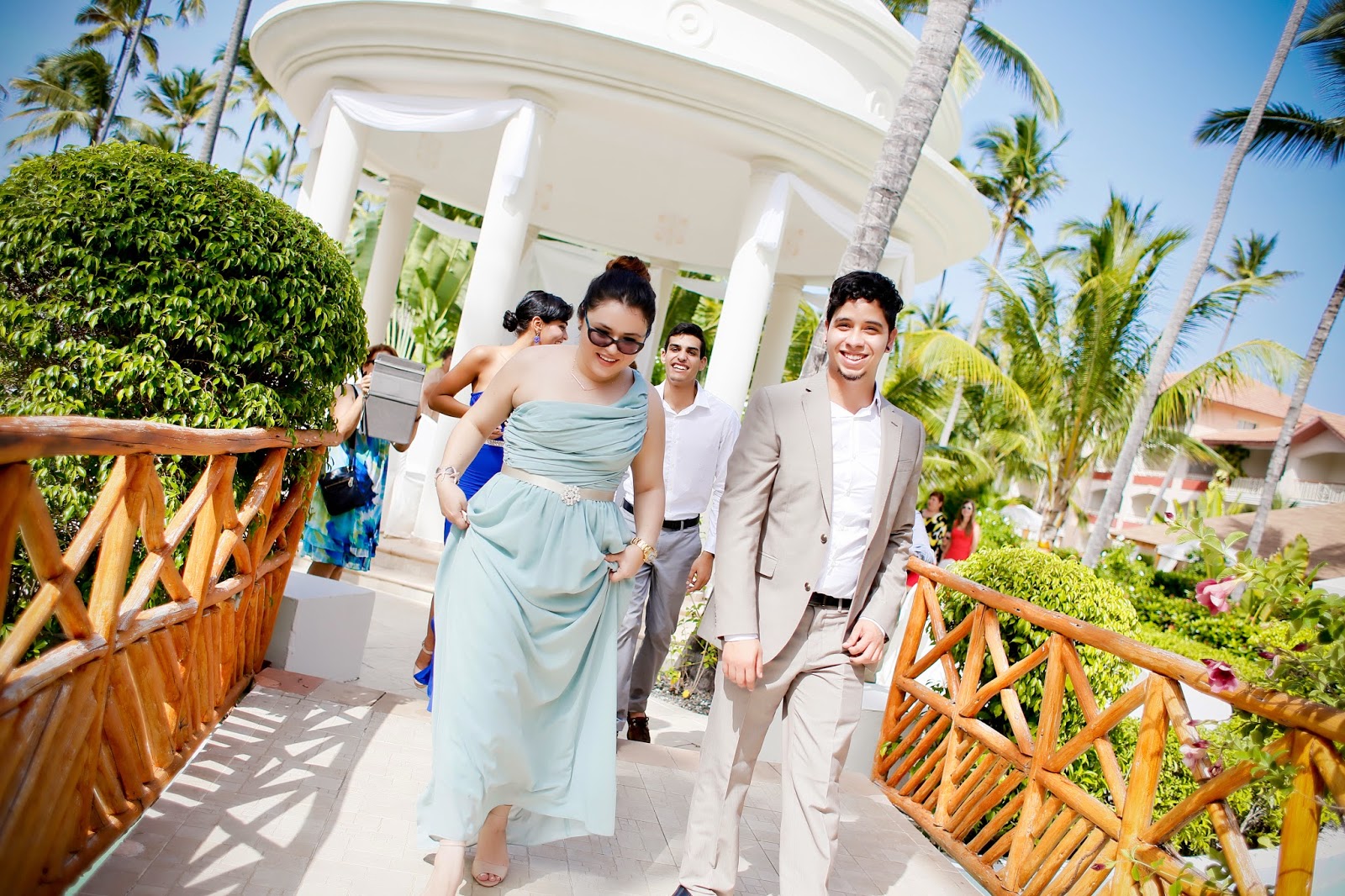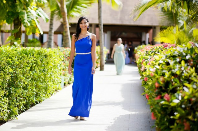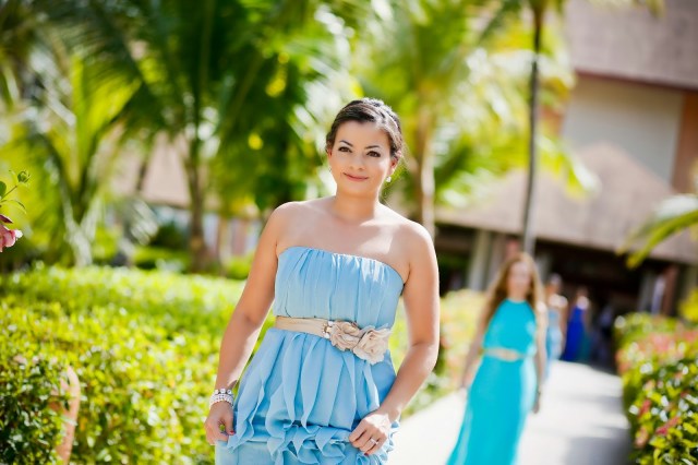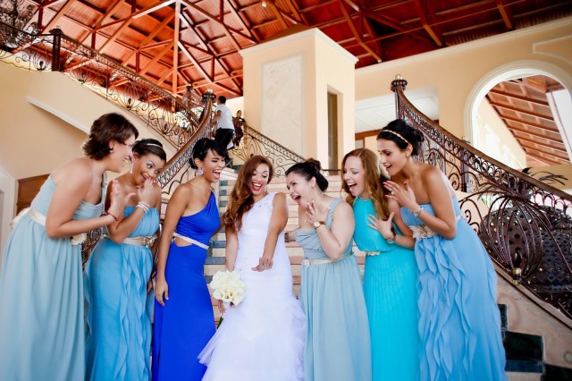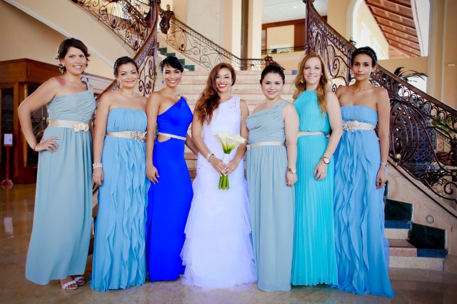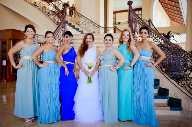 Ay, la búsqueda de los trajes de Damas. Esto fue interesante. Mi idea inicial era que todas tuvieran un traje del mismo color “Azul Brazileño”, pero con diferentes cortes. Yo quería que todas se sintieran cómodas con trajes que acentuaban sus cuerpos y estuvieran en sus presupuestos. Luego vi unas photos en donde las damas tenían distintas tonalidades del color escogido, creando un séquito con efecto “ombre” y me fascinó! De verdad que me encantó como quedamos porque todas tenían diferentes tonos del mar. (Mi hermana tuvo un percance con su traje original, que era turquesa, entonces mi querida Madre vino al rescate con un traje azul “Brazil” y ella quedó preciosa.) Así que terminé con mi Azul, y con el Turquesa, “Mist” y “Espuma de Mar” teníamos la gama completa. Ellas se veían hermosas y estaban contentas con su look.