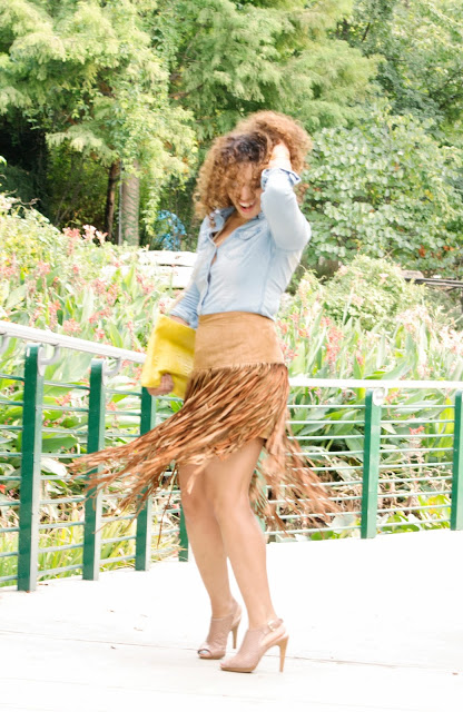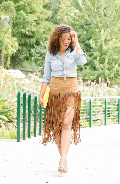Hi, my loves! I’d been on the hunt for a fun fringe skirt and I found one at JustFab. This skirt is so much fun! It’s like a midi and mini skirt all in one! The skirt is clearly the focal point of the look, so I paired it with a denim top, nude shoes and some fun accessories. Don’t be afraid to spruce it up with some bright touches like a fun clutch and fabulous jewelry. Don’t forget your best accessory, confidence!
