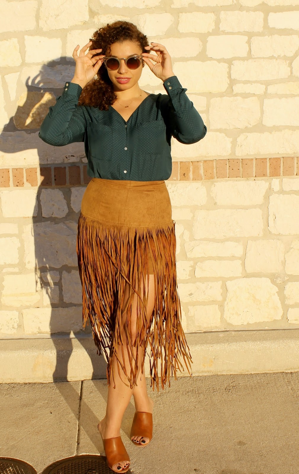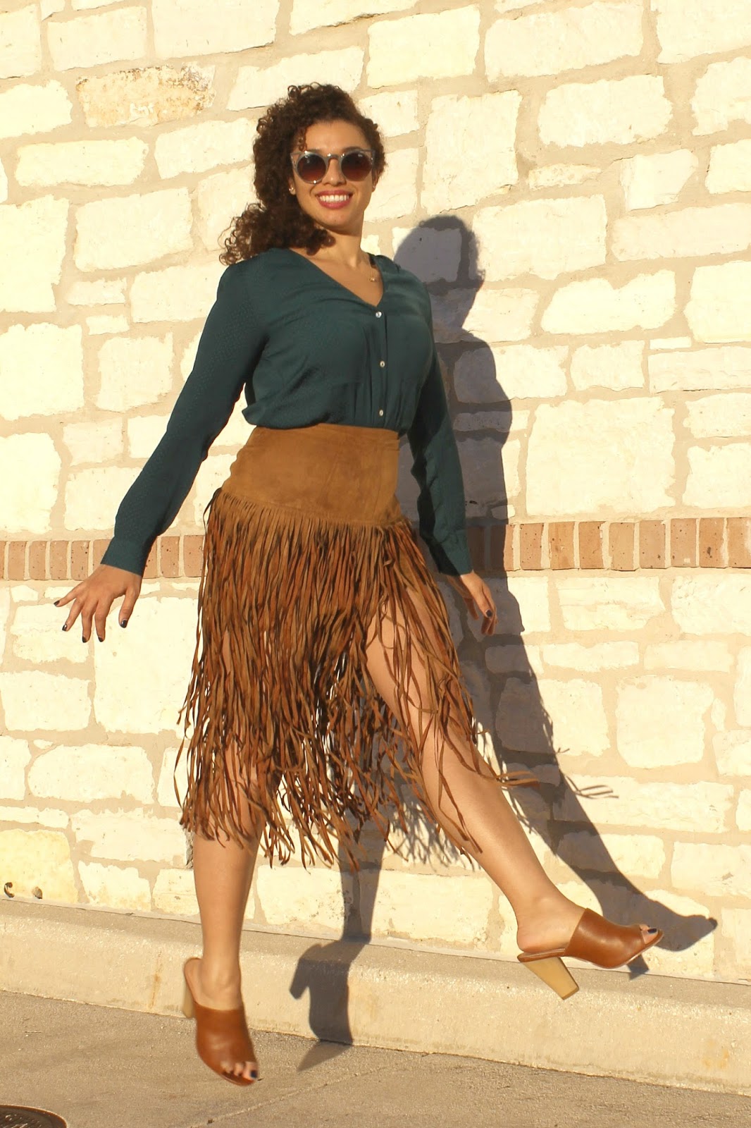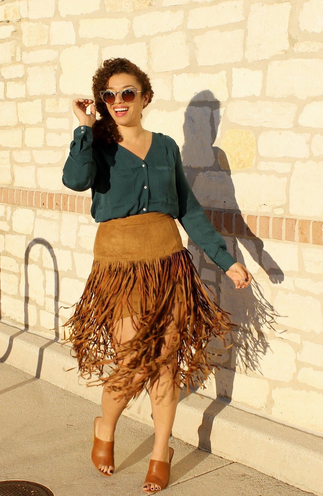 Si, me encantan los flecos. Amo como fluyen y lo divertido que son. Me encanta que se puede llevar formal o casual. Simplemente, me hacen querer bailar! Esta falda de JustFab es perfecta! Es de gamuza vegana y es una falda mini debajo de flecos midi. O sea, a quién no le gusta un 2 en 1?! El talle alto es queda muy bien y muestra mis curvas, de las cuales estoy muy orgullosa. De seguro encontraré muchas maneras de usar esta falda en el Otoño.