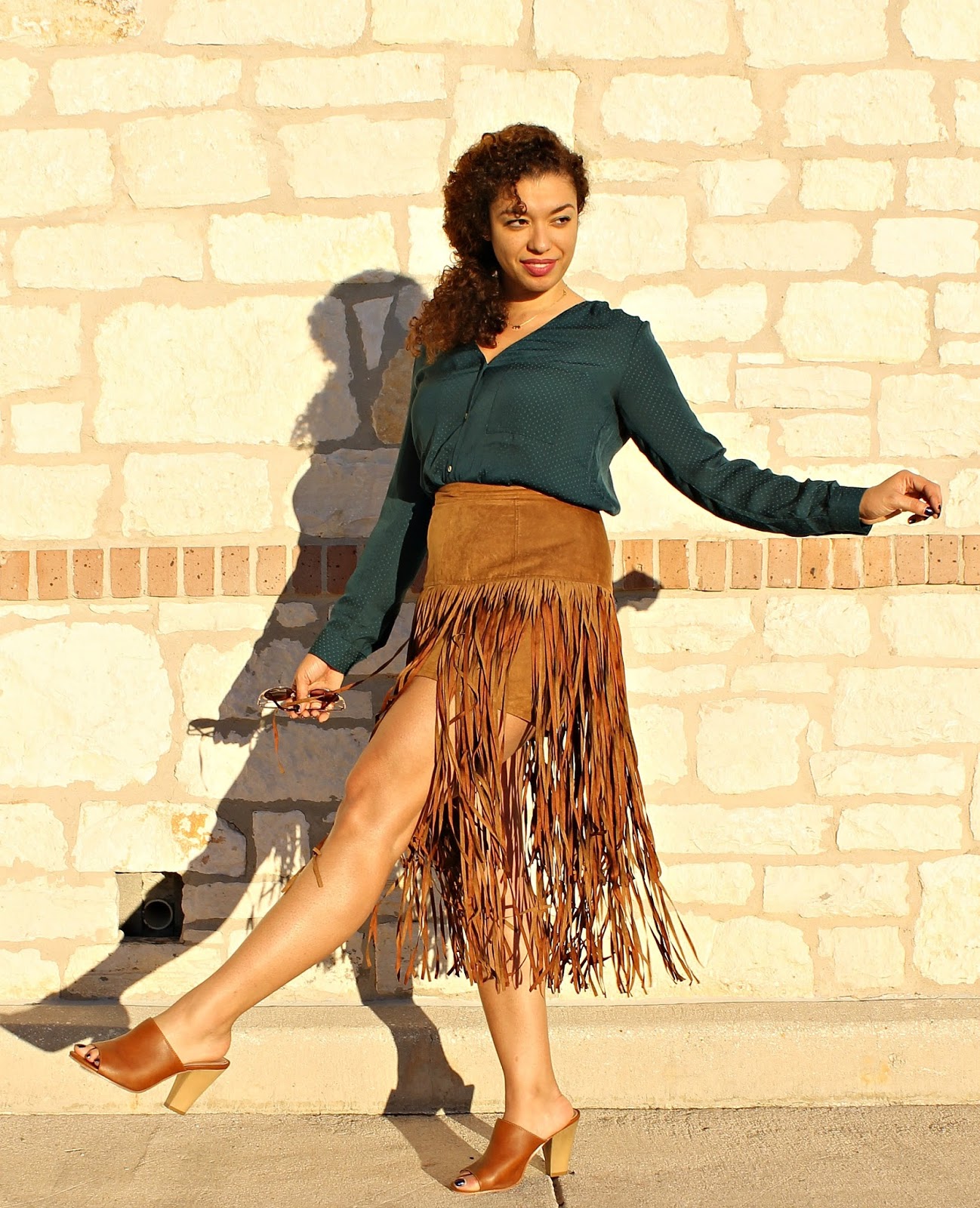 Yes, I love Fringe. I love the flow and playfulness of it. I love that I can dress it up or dress it down. It’s just makes me wanna twirl! This JustFab skirt is so perfect! It’s vegan suede and it’s a mini under the fringe midi. I mean, who doesn’t love a 2 in 1?! The high waist is very flattering while still showing off my curves, which I’m very proud of. I’m sure I can find many ways to wear this skirt through Fall.