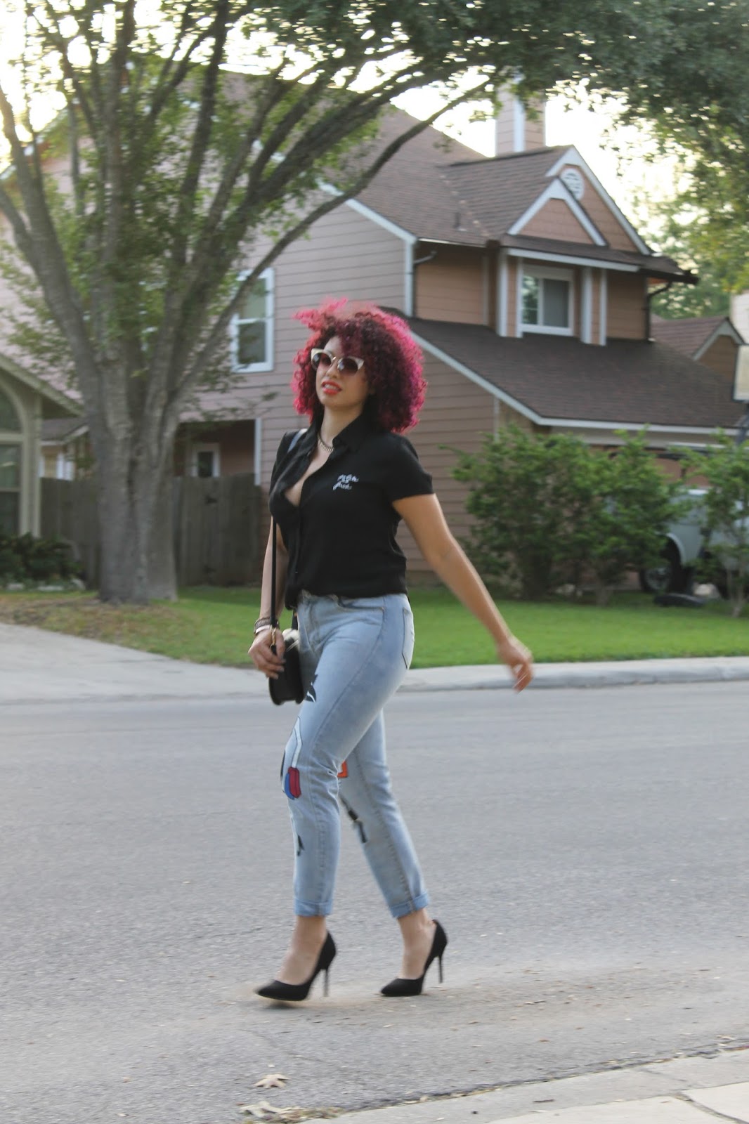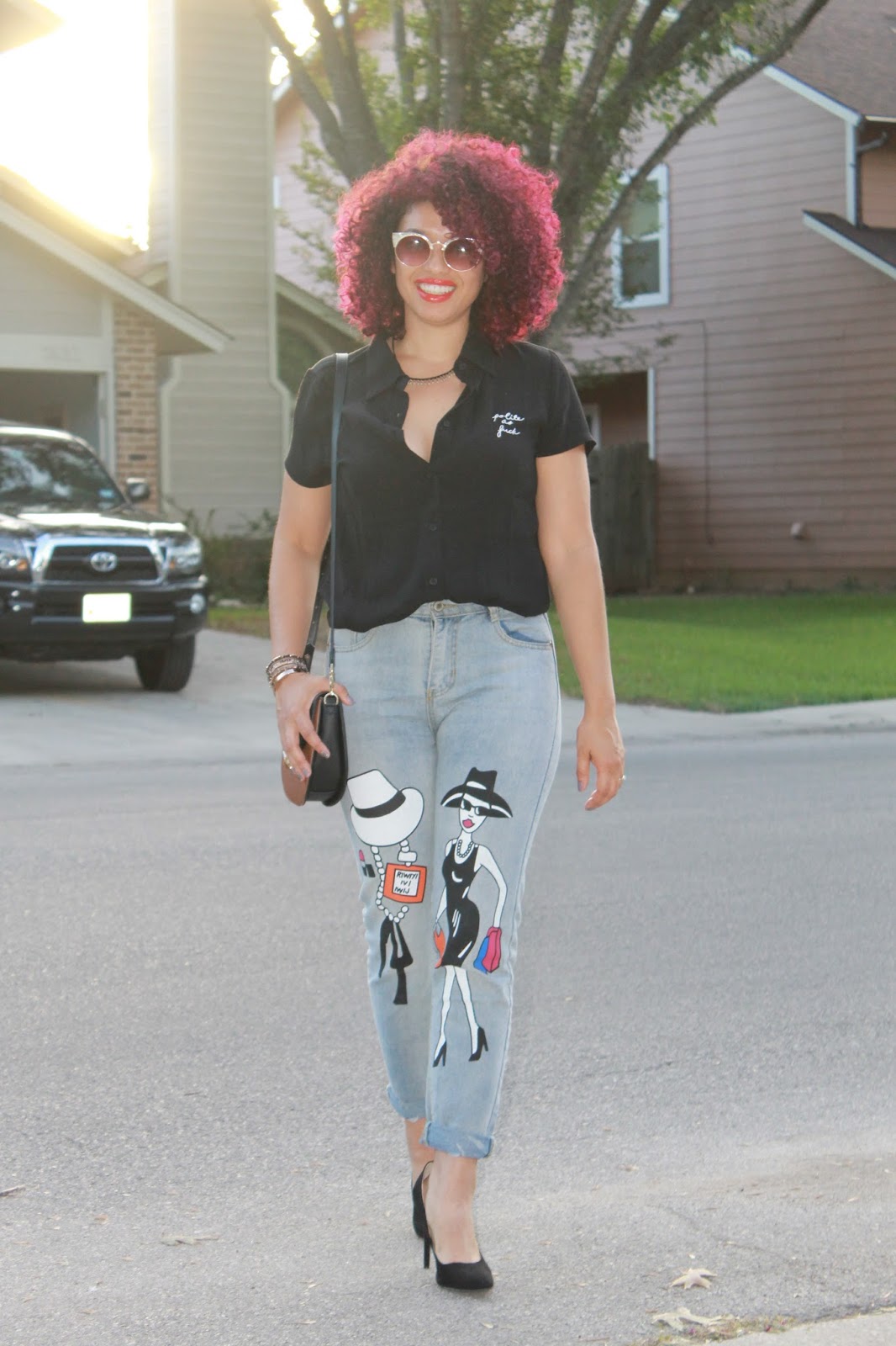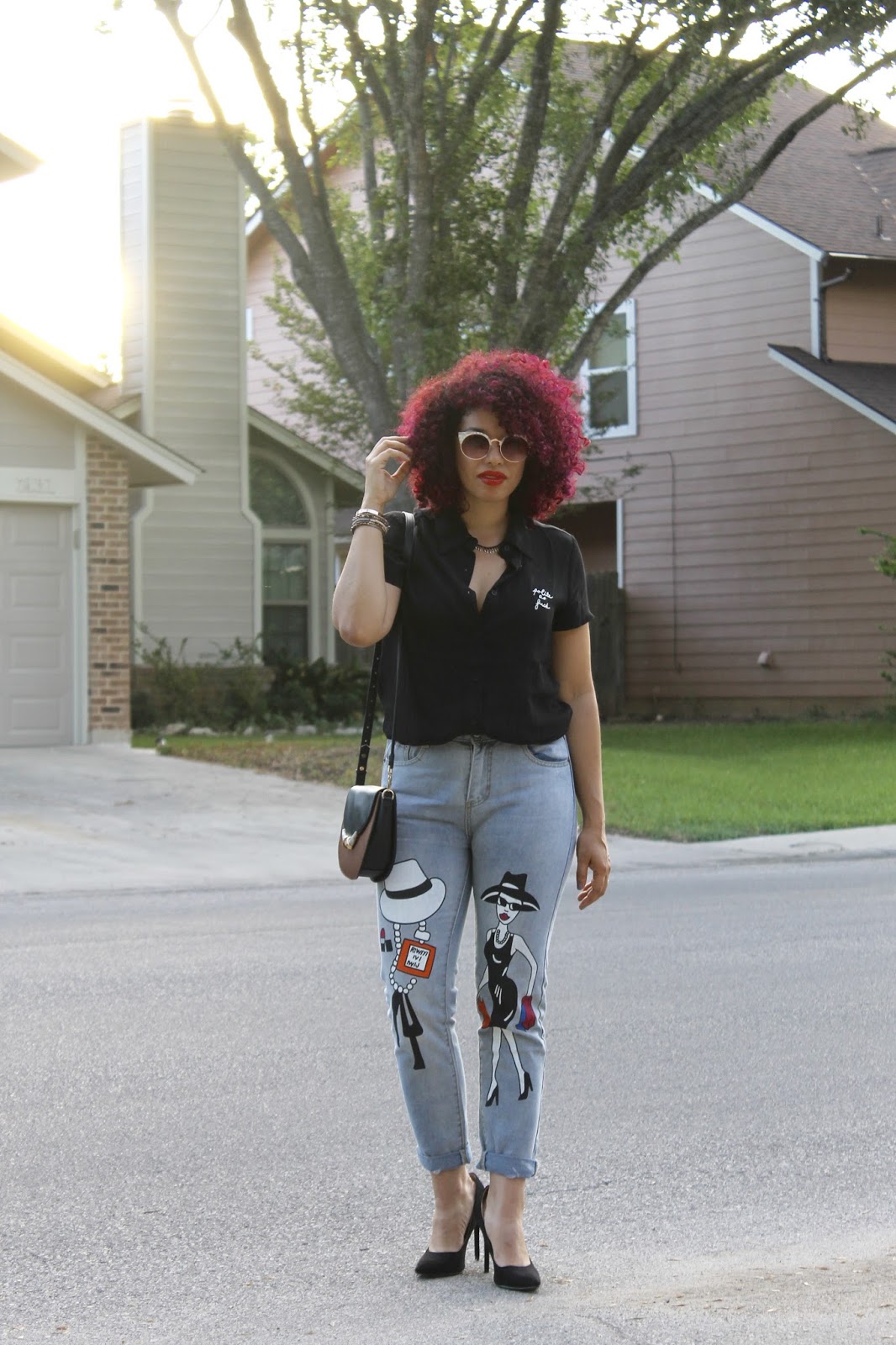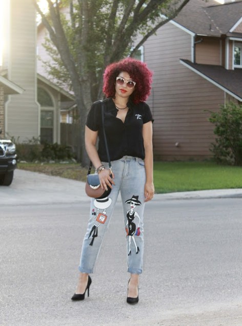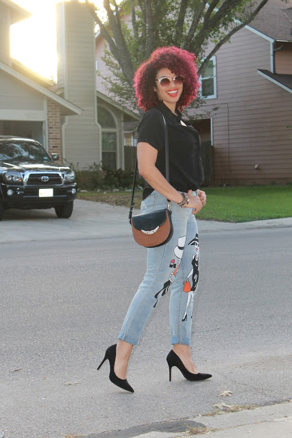 Pardon my french, but this top got me like… Haha! As we begin to transition to Fall, I start inclining towards darker colors, and as a New Yorker, Black is always my favorite color, lol. I actually go out of my way and make an effort to step out of my comfort zone and seek more color in my wardrobe, but every once in a while, I go back to black. This top is my new favorite, not just because of the funny message, but the fit and feel are so perfect. My girl Michelle from Chic’tique always has the cutest selection of clothing and accessories, and this top is no exception. When it comes to these jeans, I had seen them in a reposted pic on Facebook and looked for them desperately in Texas and online, to no avail. I finally tracked down the source of the photo and traced it to a boutique in Puerto Rico! I reached out to the shop owner and it turned out that she does ship to Texas, so I was ecstatic!! These jeans fit like a cross between mom jeans and girlfriend jeans (not as loose as boyfriend jeans), which means I love the fit on my booty! The fun print just gives my look a little something extra so I paired it with simple pointed black pumps. It was the perfect Friday date night look for dinner & drinks. Warning: Avoid wearing this top to the office if your job has a conservative dress code!